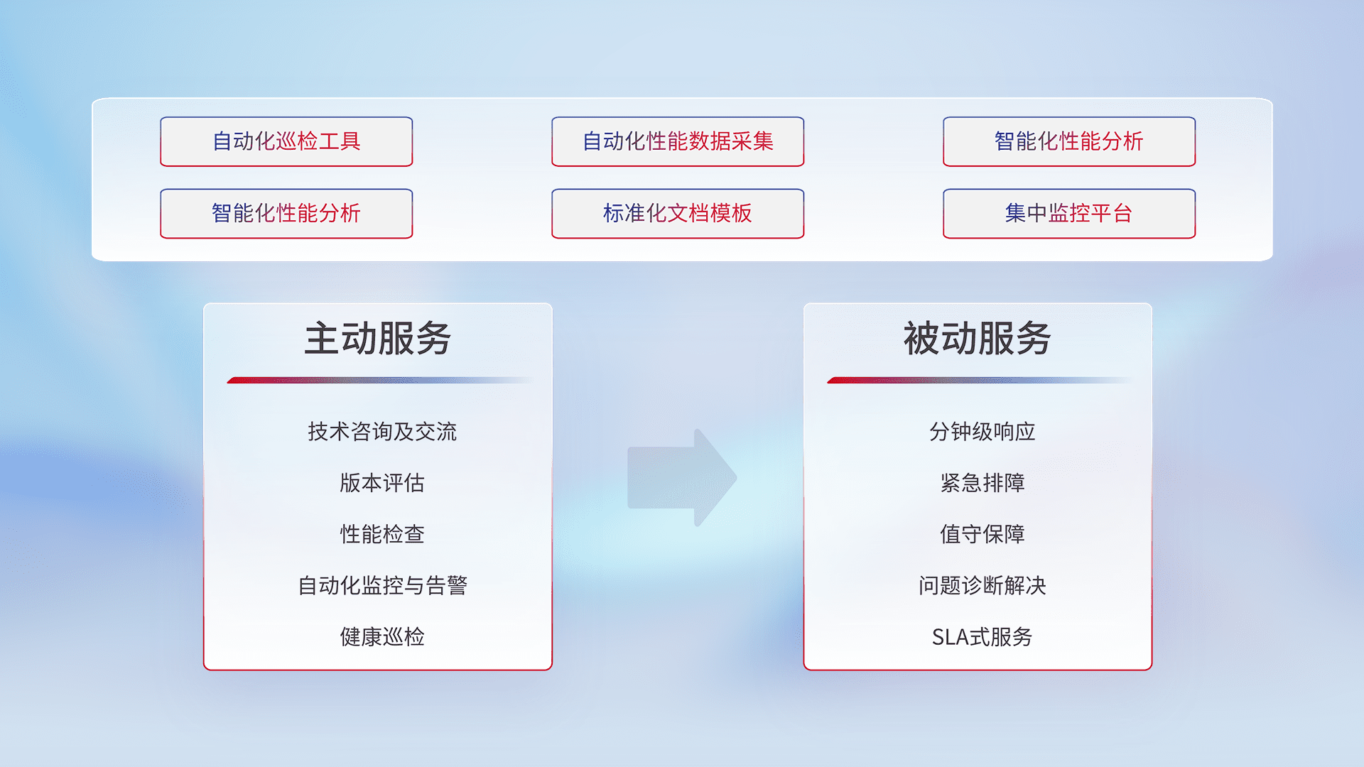 智能化工具和标准化文档,,,,保障服务质量,,,,提供主动服务(包含技术咨询、、、版本评估、、、性能检查、、、自动化监控与告警、、、健康巡检)和被动服务包含(分钟级响应、、、紧急排障、、值守保障、、、问题诊断解决、、、、SLA服务)。。。
